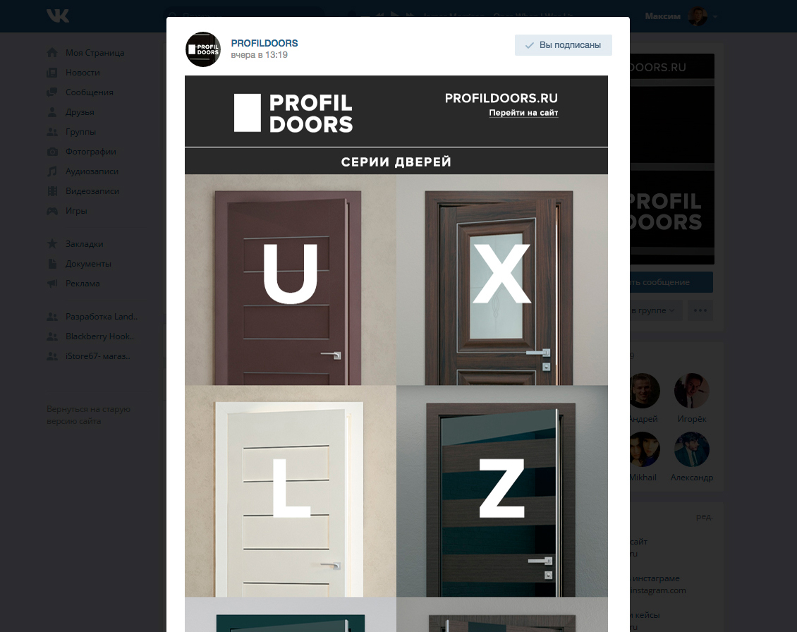 Помимо фирменного оформления аккаунта и постов, создано меню навигации по сериям и моделям дверей. Для каждой серии формировались тематические посты с учетом дизайн-концепции дверей серии в цветовом исполнении и использовании материалов